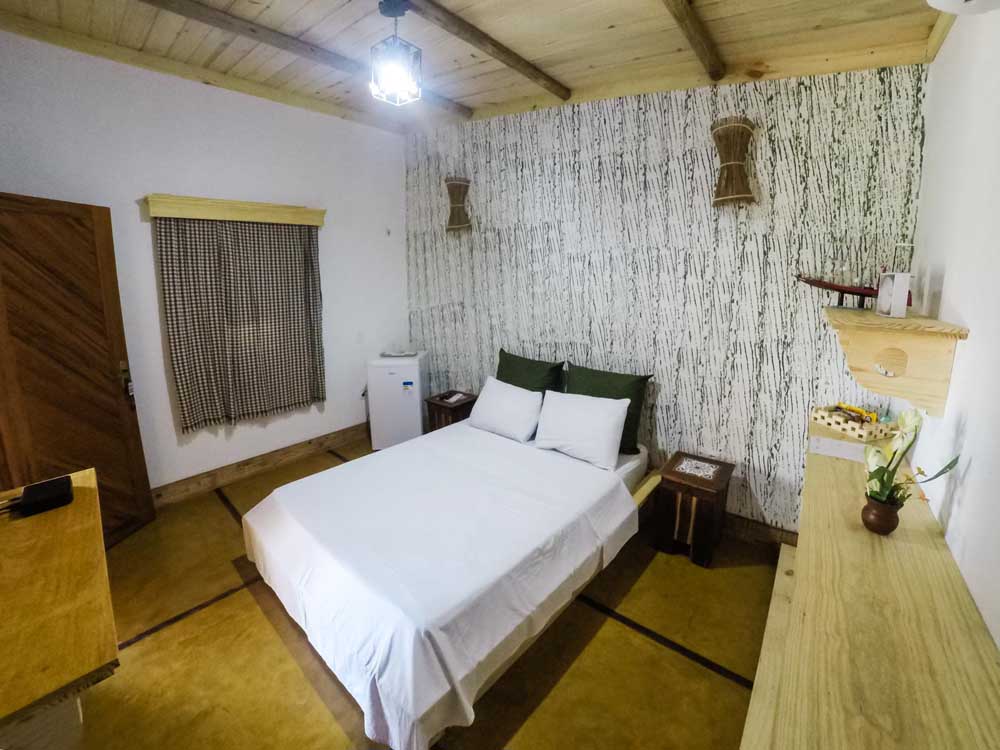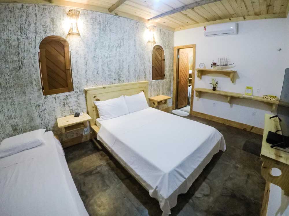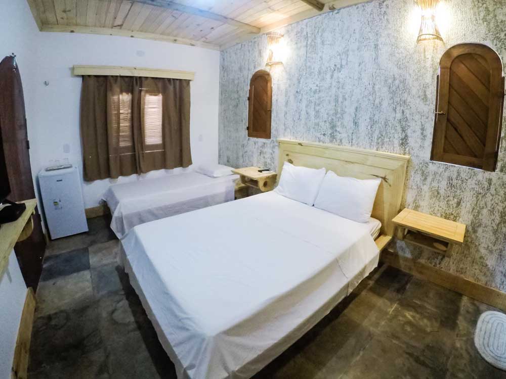 Quartos: com Ar condicionado, Frigobar, Kit de utensílios e TV com canais abertos, Cama de Casal e espaço para Rede.